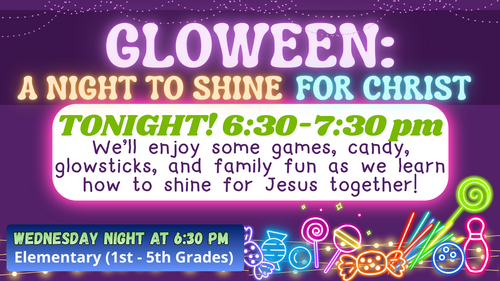 Join us TONIGHT for games, candy, glow sticks, and family fun as we learn how to shine for Jesus together!