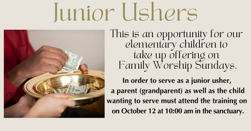 Junior Ushers – This is an opportunity for our elementary children to take up the offering on Family Worship Sundays. To serve as a junior usher, both the parent or grandparent and the child wanting to serve must attend the training on October 12 at 10:00 am in the sanctuary.