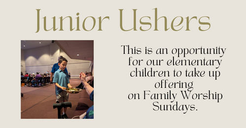 This is an opportunity for our elementary children to take up the offering on Family Worship Sundays.