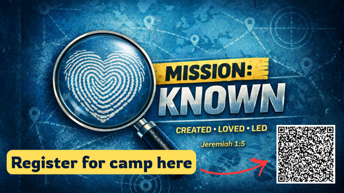 Our camp theme this year is "Mission: KNOWN" with a scripture focus of Jeremiah 1:5. Pastor Bethany Tibbs will be our Early Elementary speaker, and Pastor Dustin Bilbrey will be speaking for our Tweens. We are excited for how God has already been working and moving as they are preparing to lead our kids this summer.